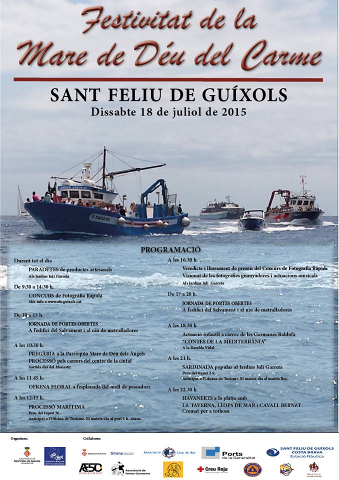 Sant Feliu de Guíxols Dissabte 18 de juliol de 2015 Programació Durant tot el dia -Paradetes de productes artesans. Jardins de Juli Garreta De 09.30h a 14.30h -Concurs de fotografia ràpida. Més informació a www.aficguixols.cat De 10h a 13h -Jornada de portes obertes. A l’edifici del Salvament i al Niu de Metralladores A les 10.30h […]