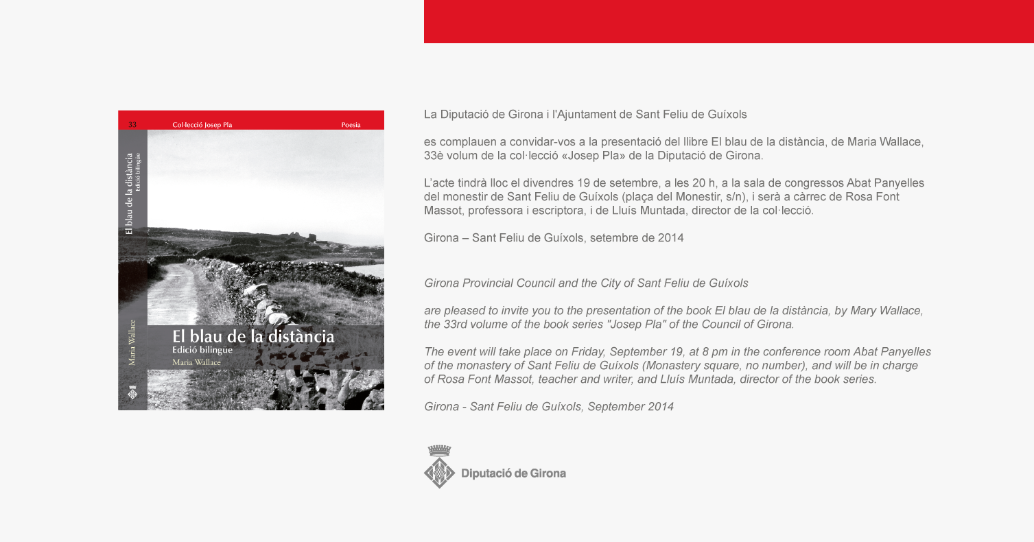 El proper divendres 19 de setembre a les 20:00h a la sala de congressos Abat panyelles del monestir de Sant Feliu de Guíxols tindrà lloc la presentació del llibre “EL BLAU DE LA DISTÀNCIA” de Maria Wallace. Aquest llibre correspon al 33è volum de la col·lecció “Josep Pla” de la Diputació de Girona.