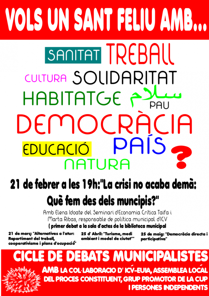Segons Informa Radio Sant Feliu Dos grups polítics de Sant Feliu de Guíxols, ICV-EUiA, el grup promotor de la CUP local i també el moviment ciutadà Assemblea Sant Feliu de Guíxols-Vall d’Aro del Procés Constituent, s’han posat d’acord per impulsar un cicle de debats municipalistes que començarà aquest divendres, 21 de febrer, a les 19h a la Biblioteca Municipal de la ciutat.