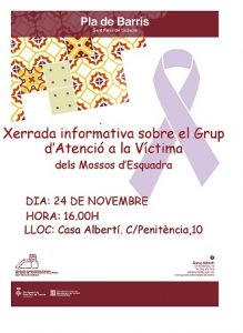 El proper dilluns 24 de novembre a les 16.00h a la Casa Albertí, tindrà lloc la XERRADA INFORMATIVA SOBRE EL GRUP D’ATENCIÓ A LA VICTIMA DELS MOSSOS D’ESQUADRA.