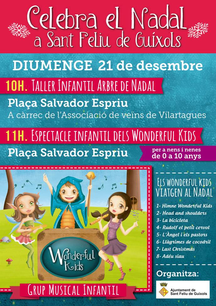 Us convidem a portar als vostres fills i filles, néts i netes, nebots i nebodes al taller infantil de decoració de l’arbre de Nadal i seguidament a l’espectacle infantil de WONDERFUL KIDS el proper diumenge dia 21 de desembre, a partir de les 10 del matí, a la Plaça Salvador Espriu.