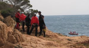 En aquest punt de la Costa Brava es van desplegar una quarantena d’efectius per terra, mar i aire. Pel cel, dos helicòpters de Salvament Marítim i dels Bombers de la Generalitat es van enlairar i van estar observant tant arran de costa com mar endins.